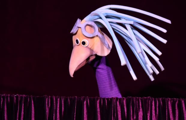 A performance of puppets, both modern and classic, abstract and realistic, attached to rods and strings, animated using fingers and hands, using hidden or obvious manipulation, a variety of materials, telling lots of stories.