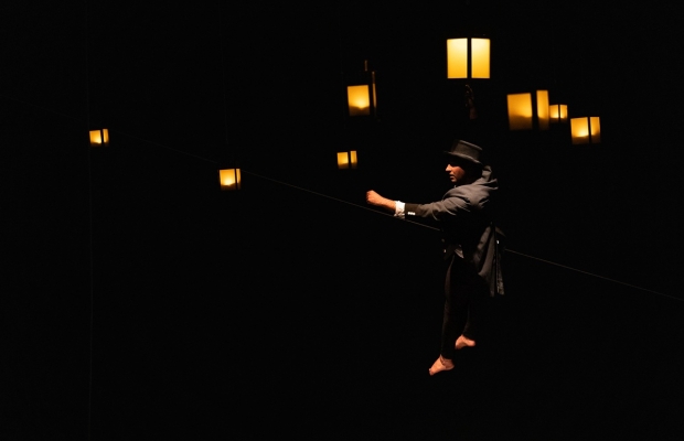 A visual theater show without words, combining mime, clowning and an aerial circus.
