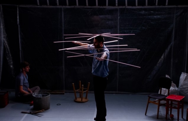 The show embraces theatrical language that combines new circus acrobatics with story theater, accompanied by a rare music machine.