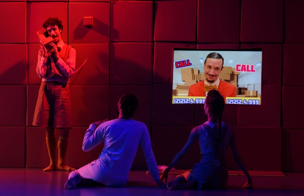 PayPer Play tells the story of a lonely character living in a room entirely made of cardboard boxes, secluded from the outside world. His only connection to reality: a tv screen and a crazy salesman. Trying to fill the inner void, he seeks for an escape to solitude through compulsive online shopping.